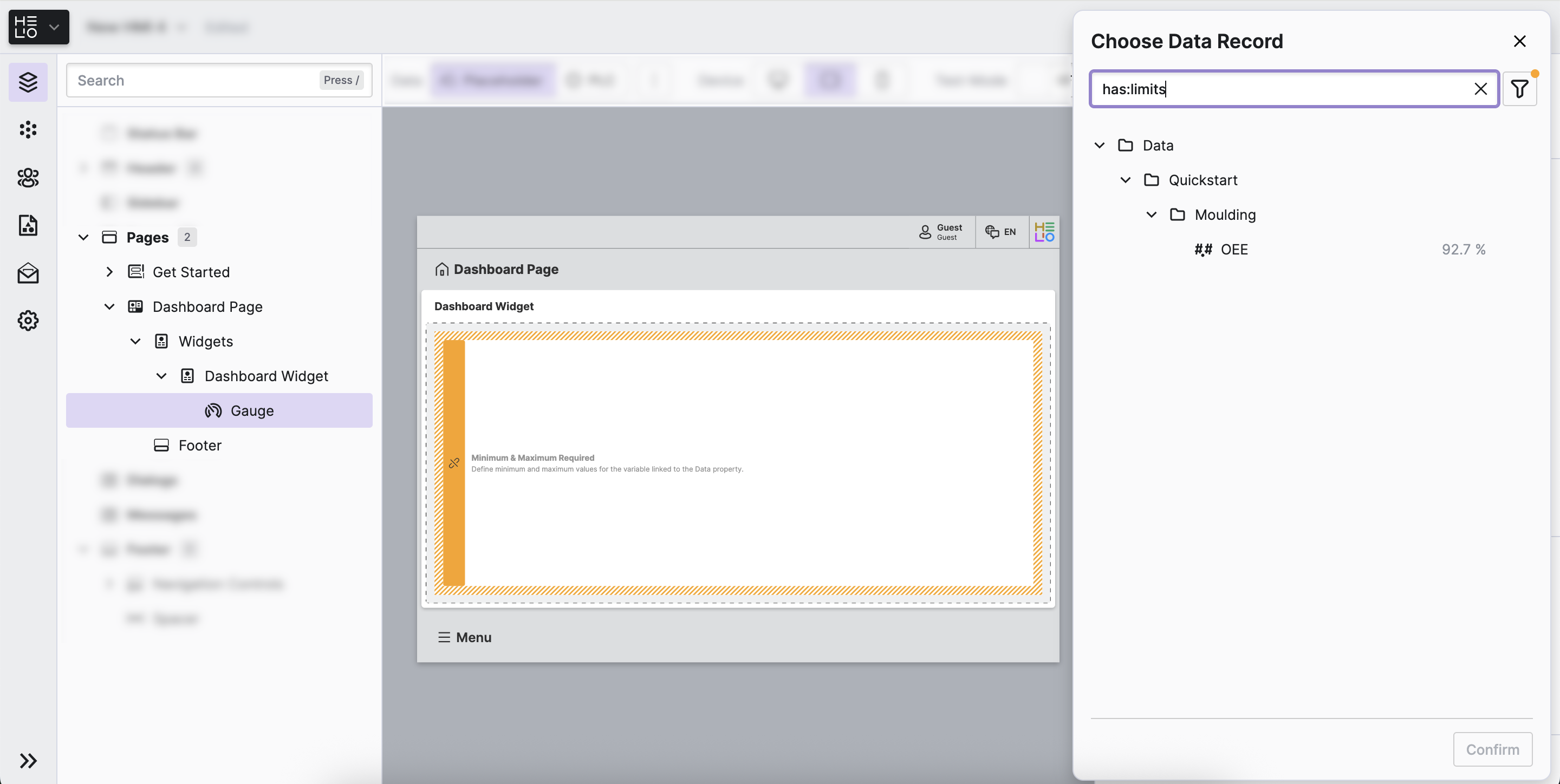 We would like to display the OEE in the form of a gauge and some additional numbers related to our production quality. Let's start with the gauge, since it will be the eye-catcher of our dashboard.