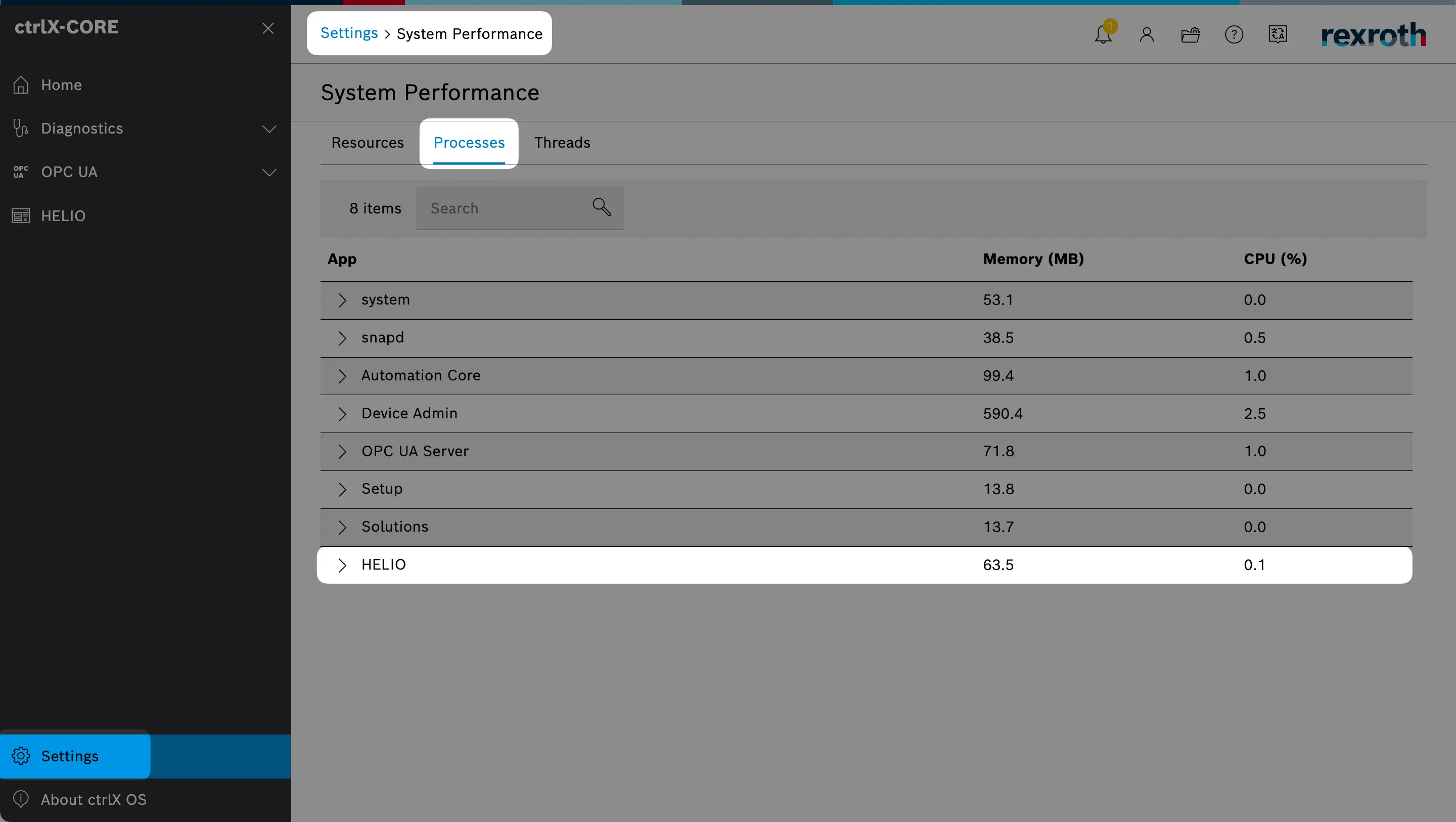 You can validate that HELIO is up an running by navigating to Settings > System Performance > Processes and making sure that there is an active
