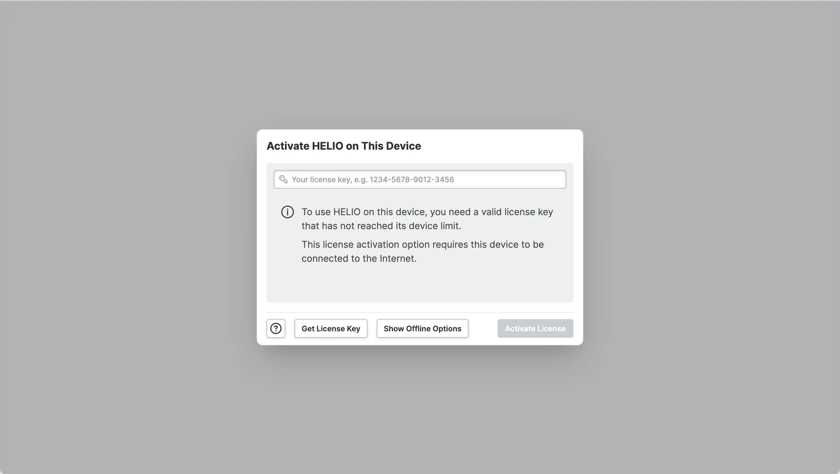 If you start HELIO on a machine for the first time and haven't activated it yet, HELIO will ask you for a license. Paste in your license key and submit. Keep in Mind that a HELIO Trial License can only be activated on 5 Seats.