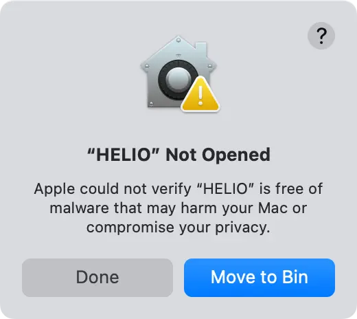 When executing HELIO for the first time, macOS might warn you that HELIO cannot be started since the executable is not yet verified.