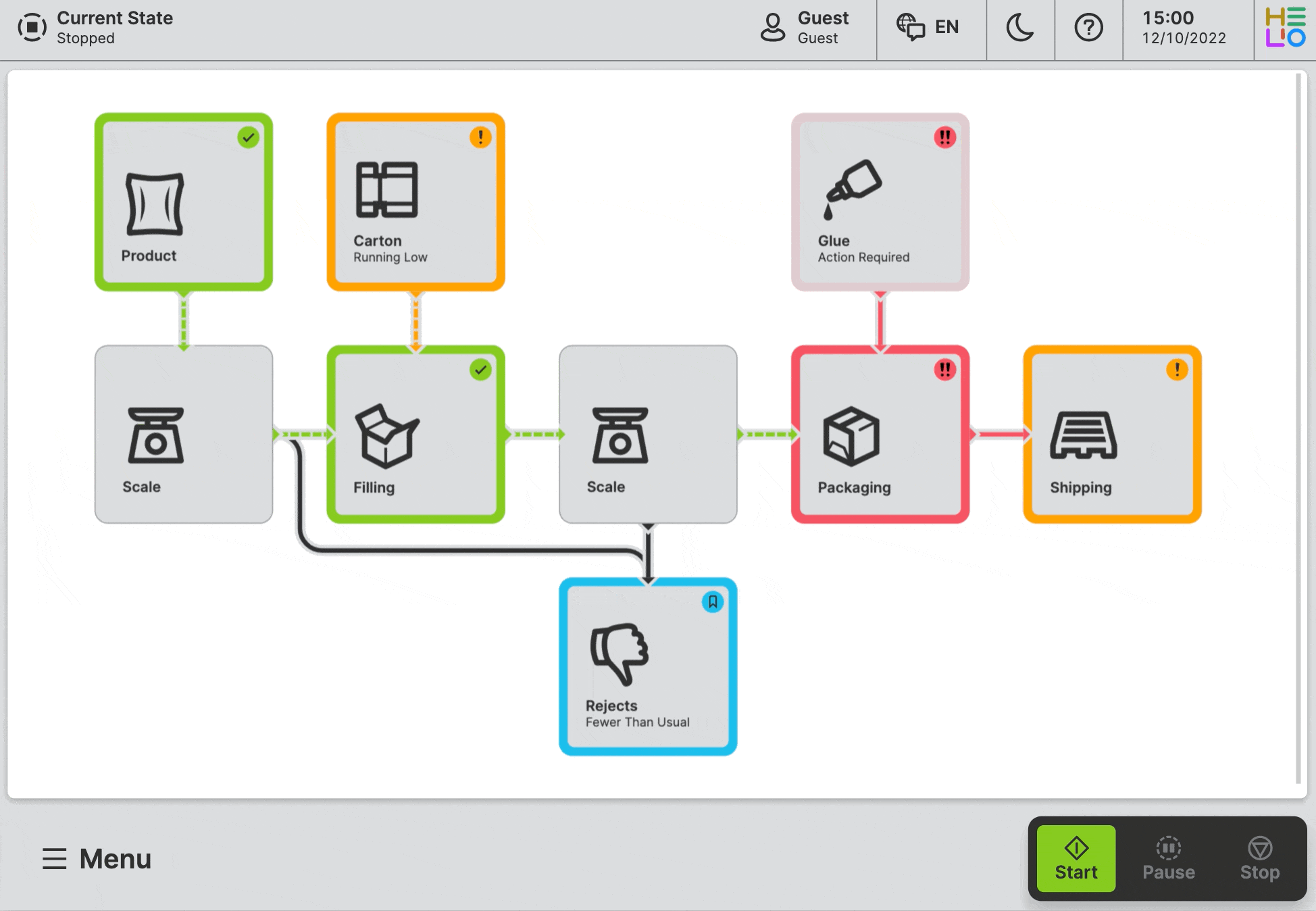 Now, our page displays all the parts of our machine and the flow direction within. However, there is still something missing. Let's bring our flow map to life by adding data and statuses.