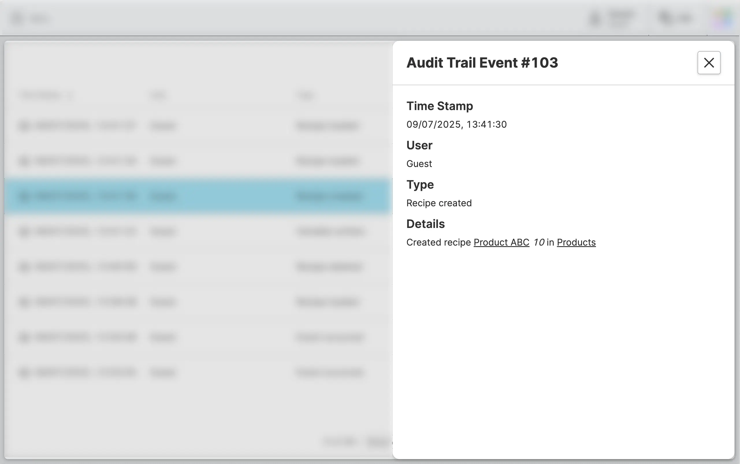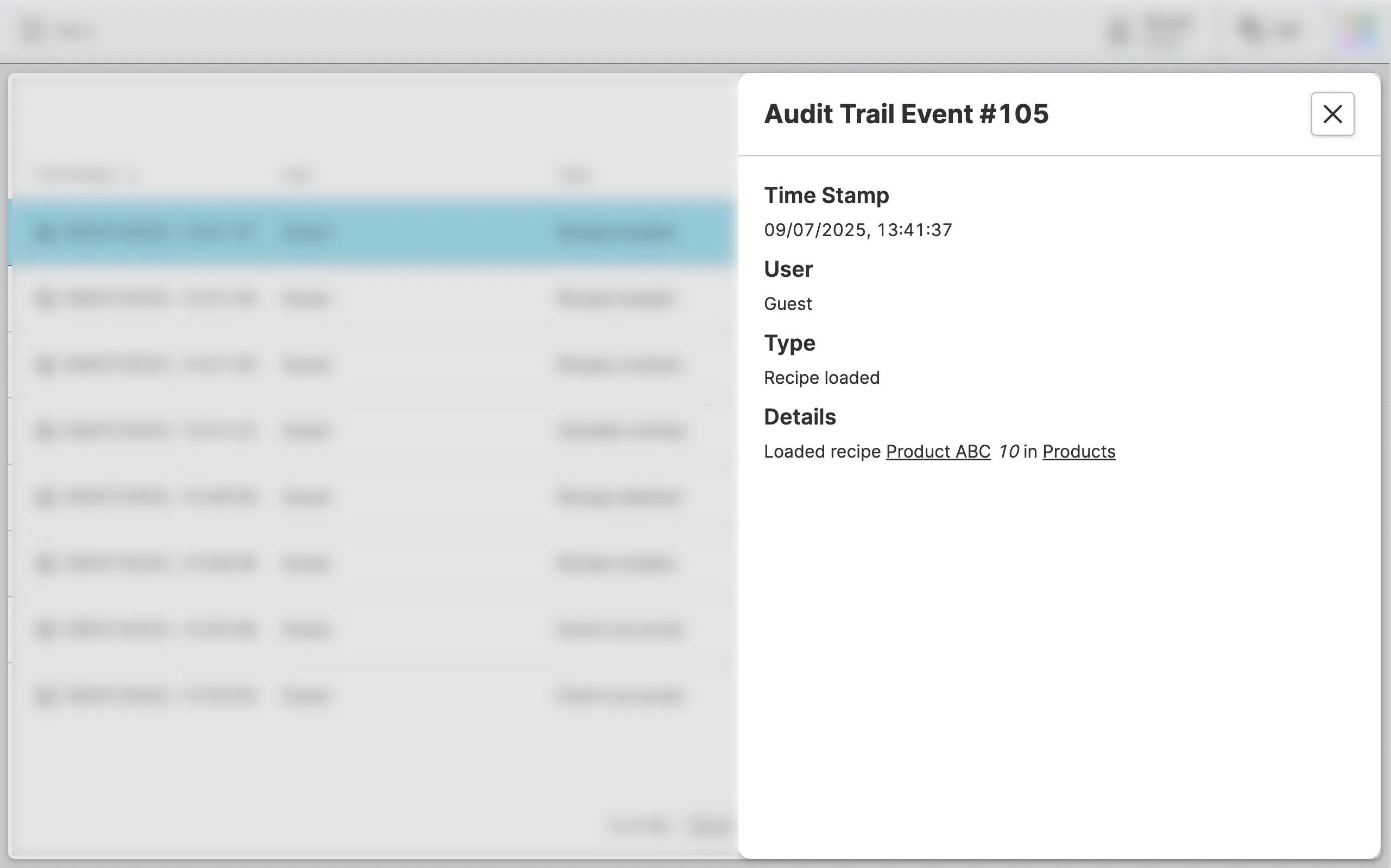 After recording some events, we can navigate to the Audit Trail Page, which will now contain our additional recipe events.
