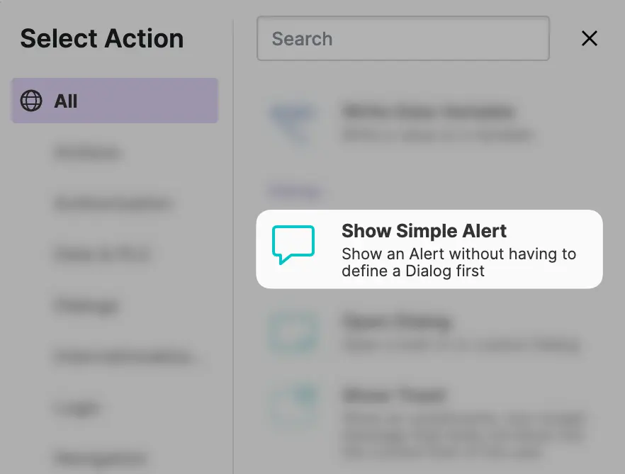 Here's an example of a basic custom action that shows a native alert using the browser's built-in alert() method.