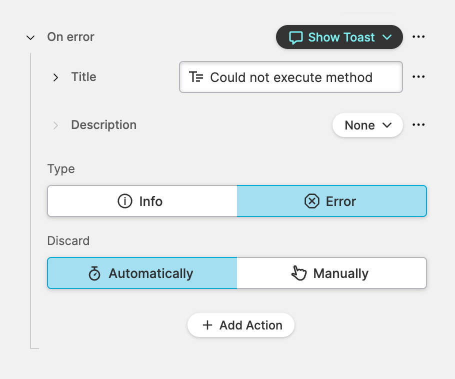 Choose Automatically to discard the toast without user interaction after 5 seconds. Choose Manually if you would like operators to dismiss the toast explicitly.