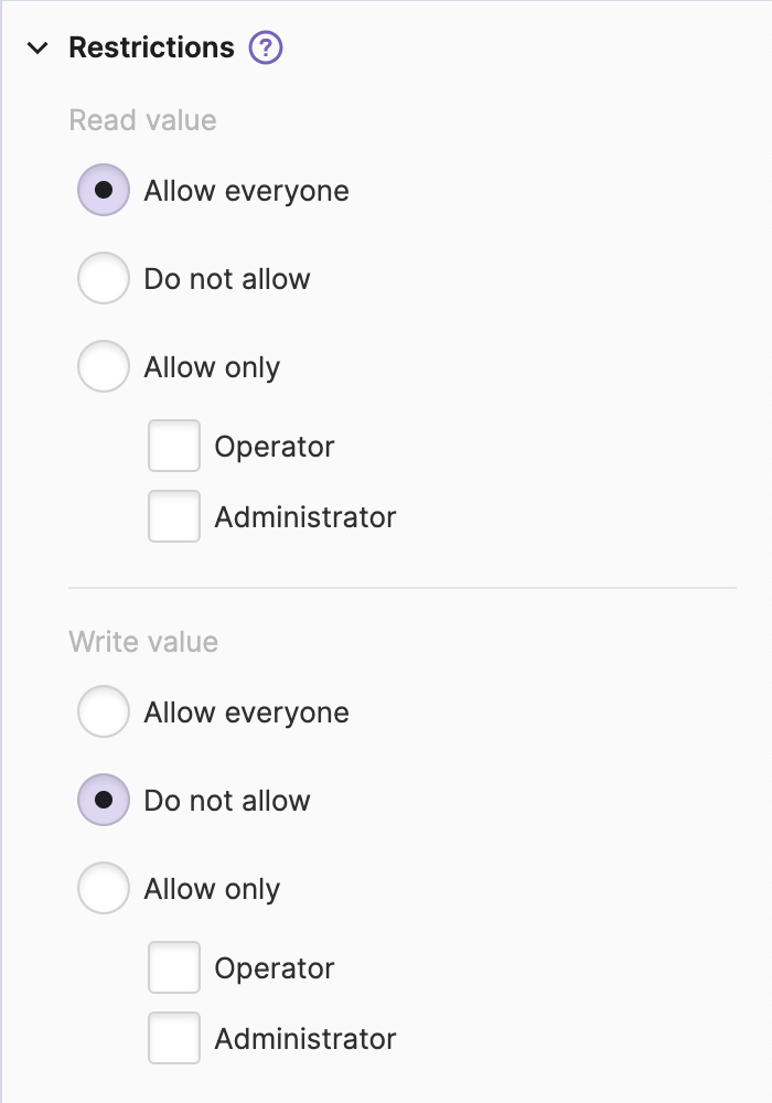 You can restrict access to HMI Data Variables from within the HMI Data Explorer. This ensures that these restrictions are applied to all pages and elements that use the variable.