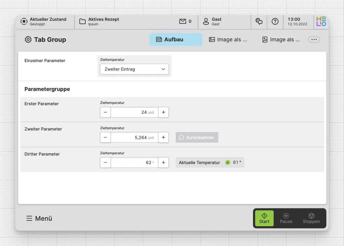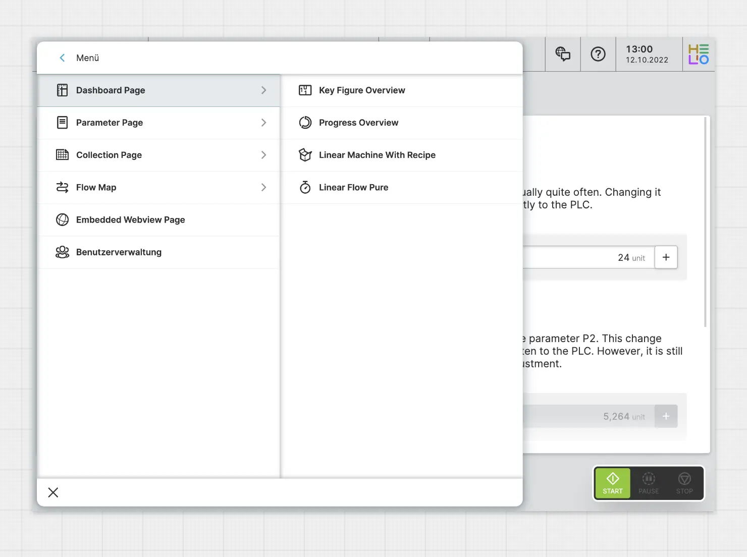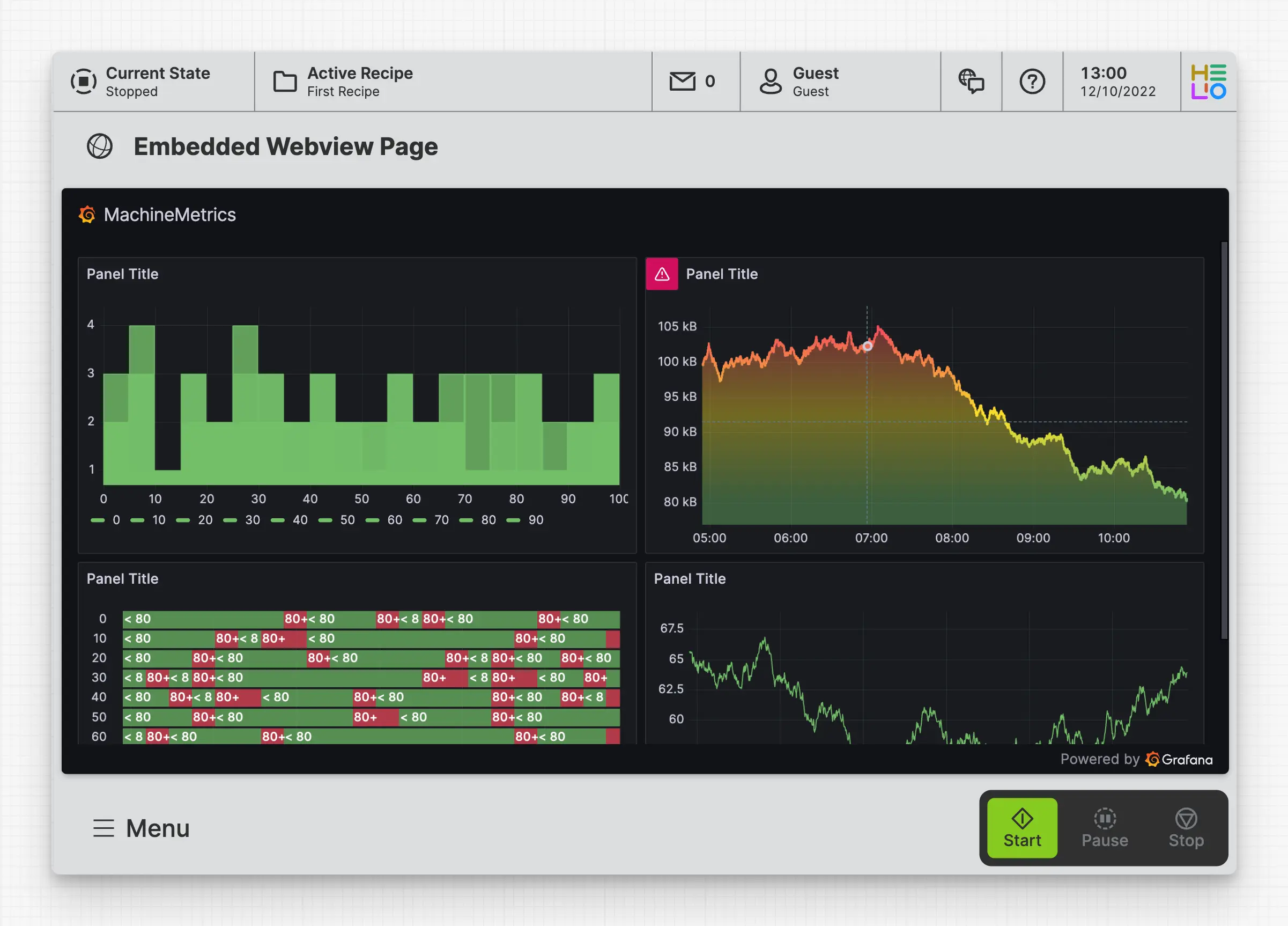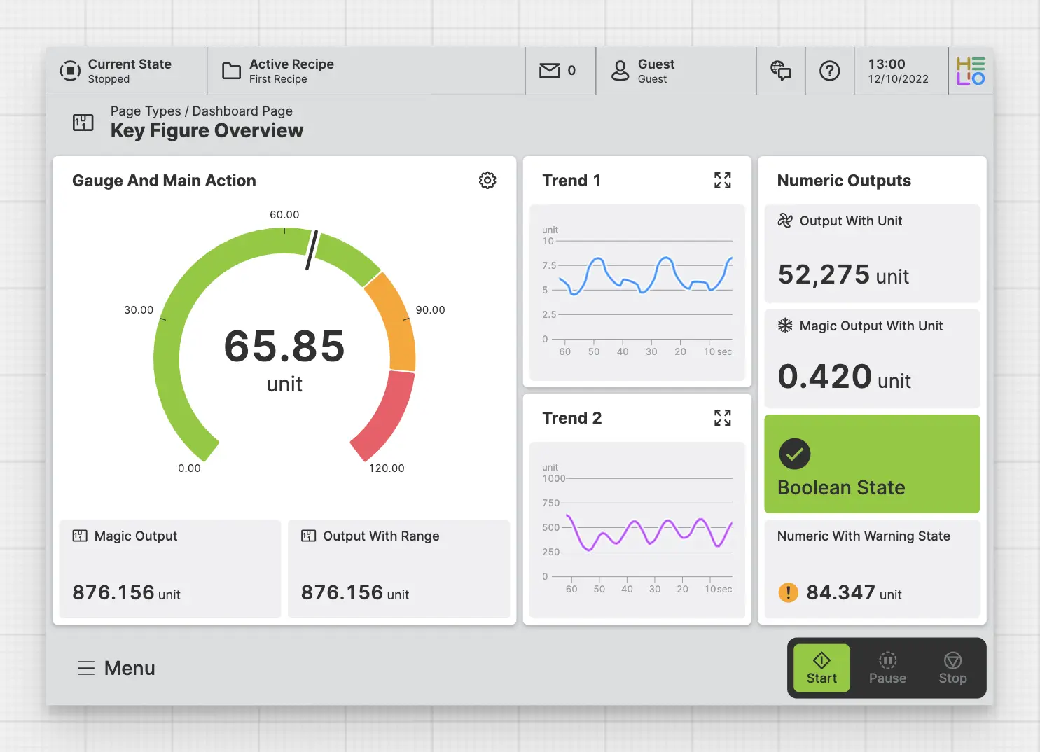 A Dashboard Page provides operators with an overview of the machine's performance, even from a distance and is therefore not scrollable but rather provides an absolute positioned layout. It helps users make informed decisions based on the machine's current state.