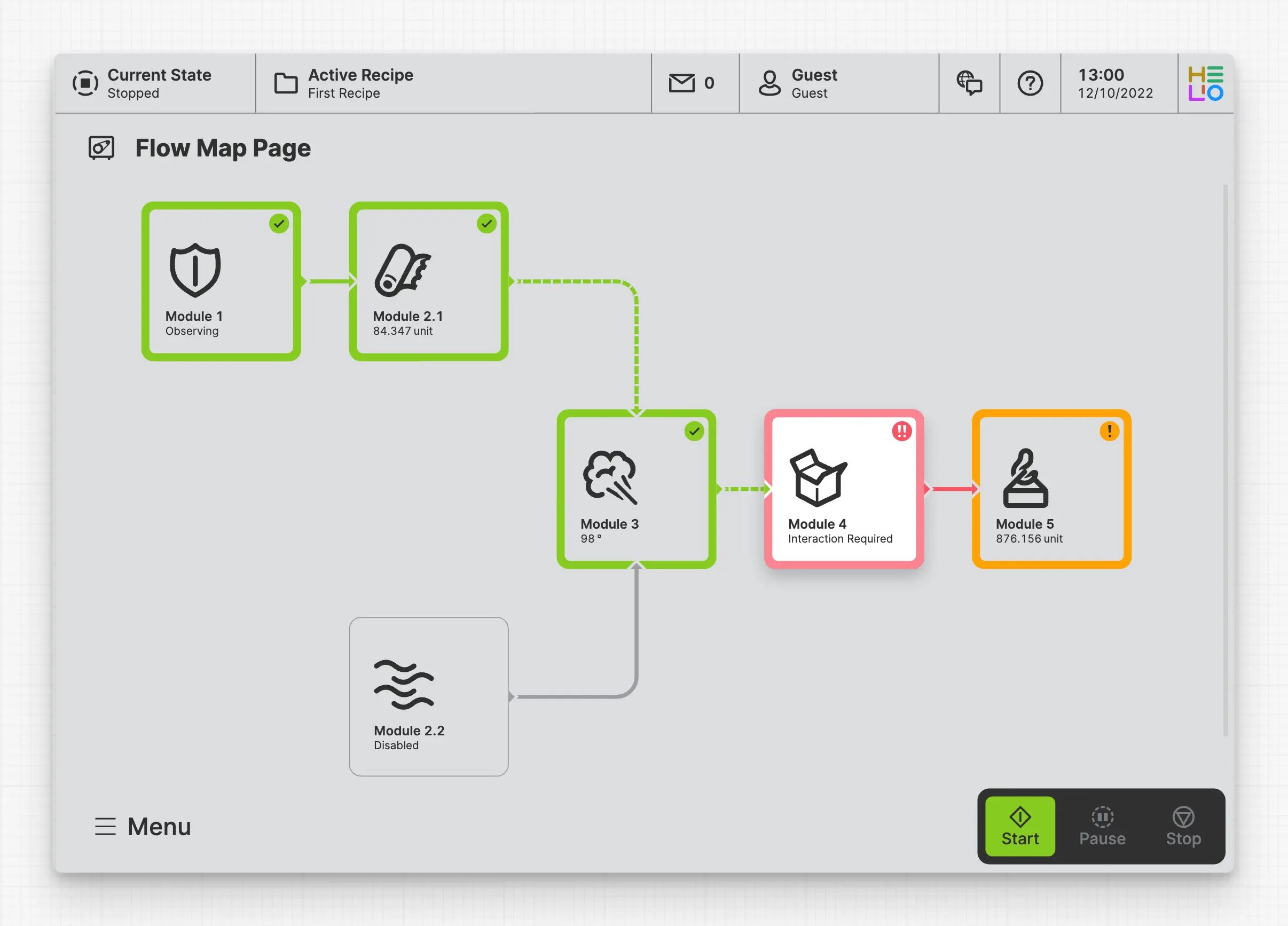 A Flow Map Page offers the operator a bird's-eye view by displaying visual maps that illustrate the flow within a machine or process. It helps operators understand complex workflows by presenting them in a clear, graphical format.