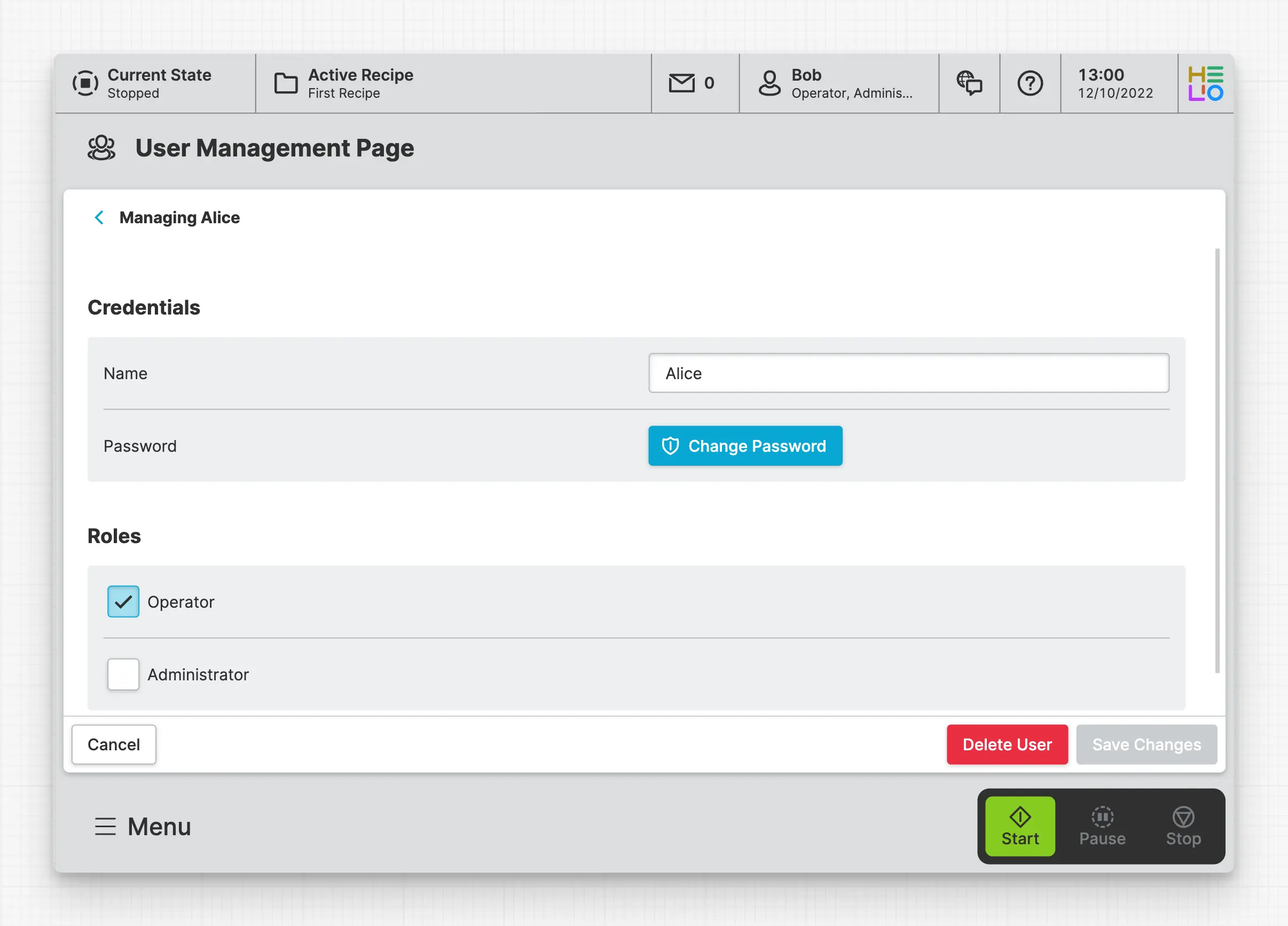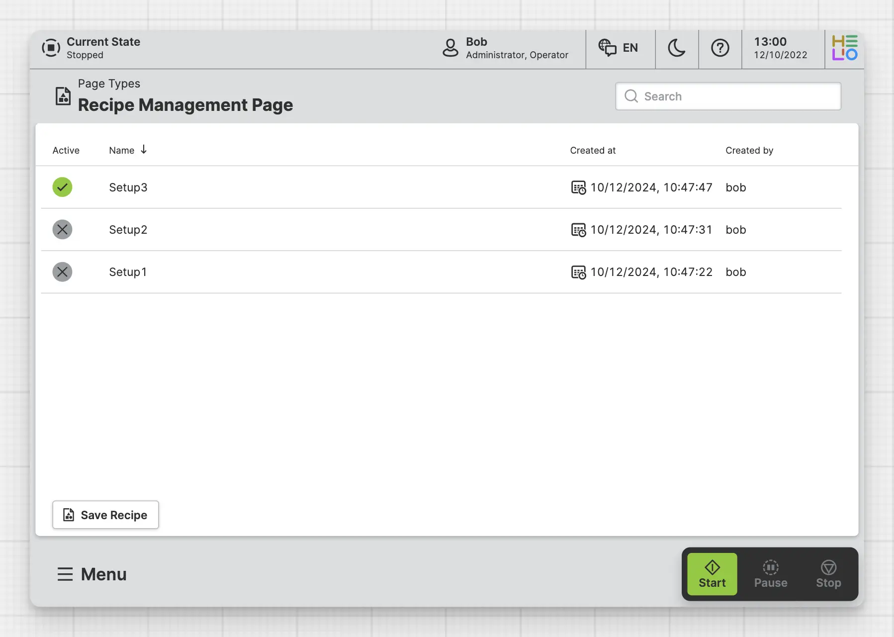 A Recipe Management Page enables operators to save and load recipes within the HMI.