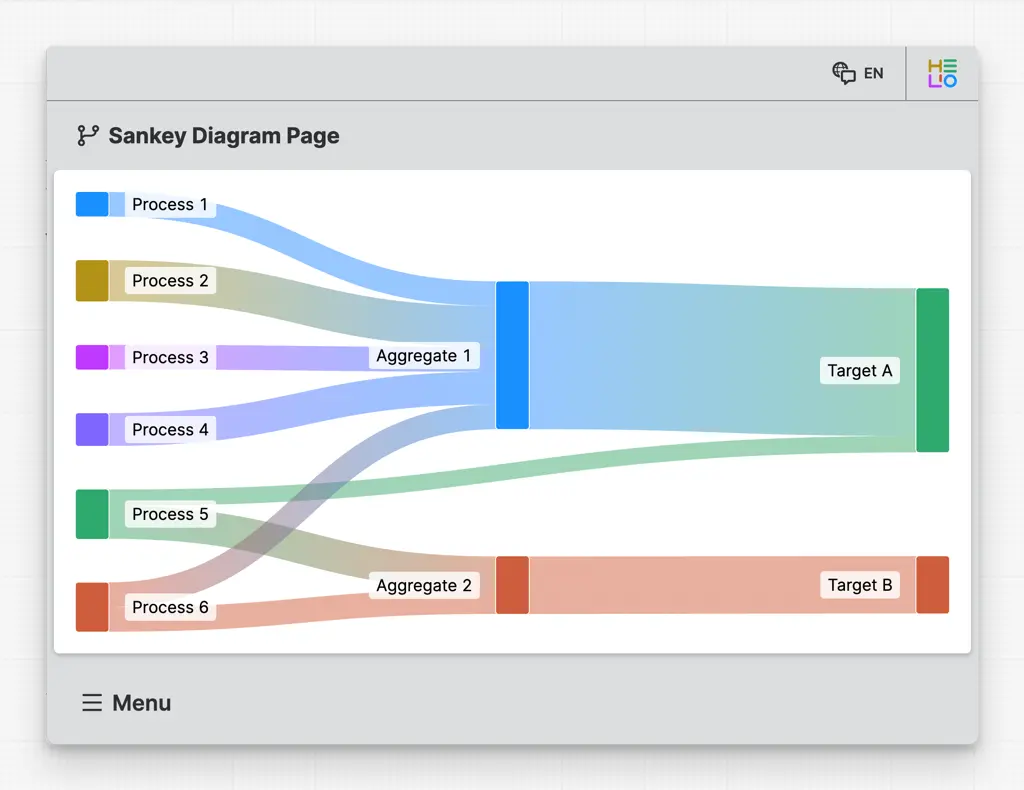 A Sankey Diagram Page helps operators visualize and understand flow distributions, where the width of connecting links represents the proportional quantity of material, energy, or resources flowing between nodes.