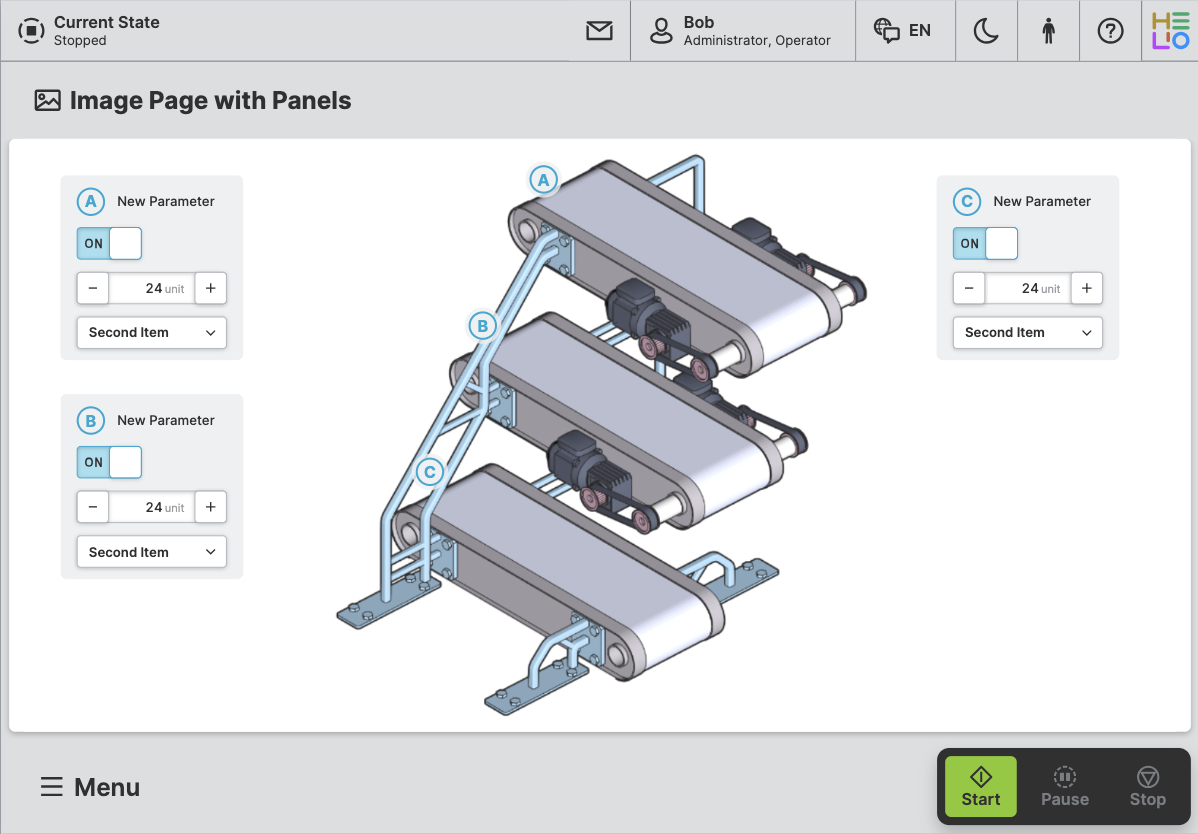 Purpose: Display a background image and then place interactive panels above it. Within the panels, you can allow operators to edit parameters or trigger actions. Use image markers and panel legends to create an interactive connection between the image and the content above it.