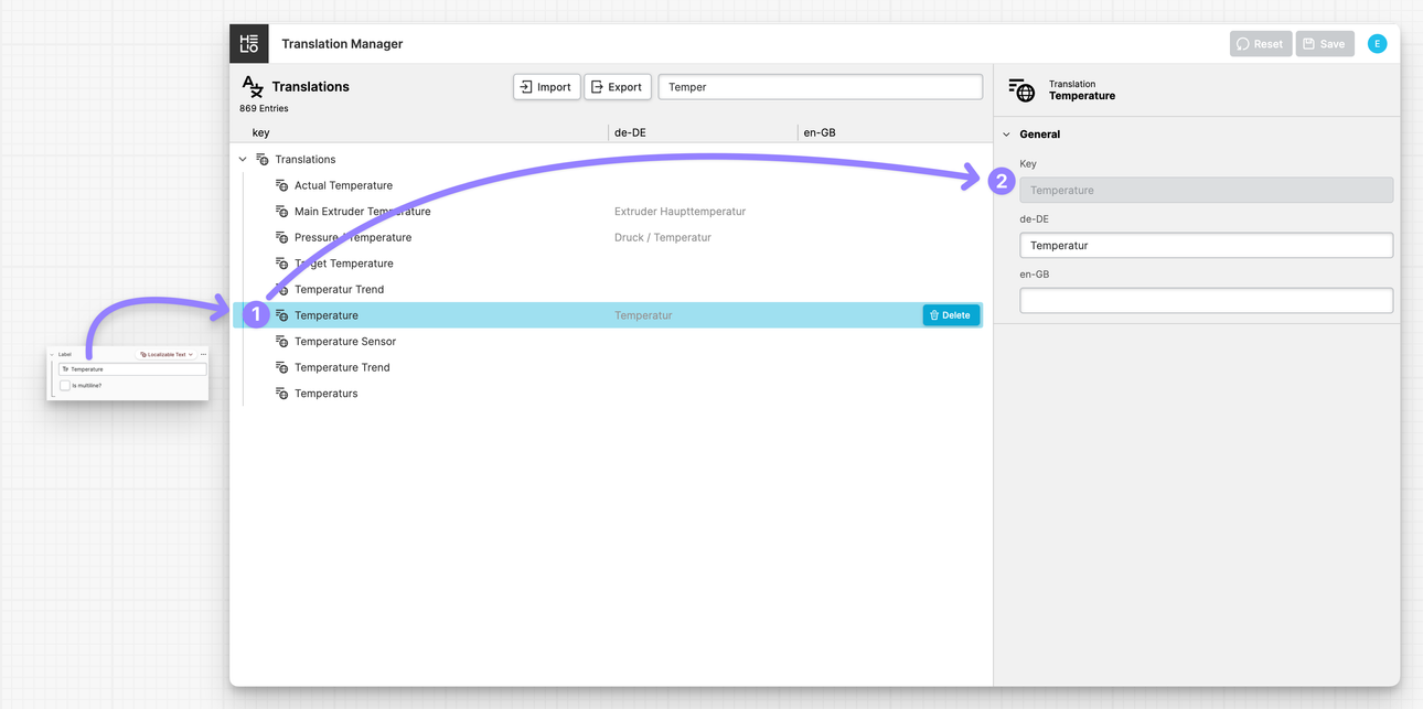 In this example, "Temperature" is the Translation Key. Whenever you enter this text in another part of the HMI, it will be automatically translated to "Temperatur" if the language is set to German aka de-DE.