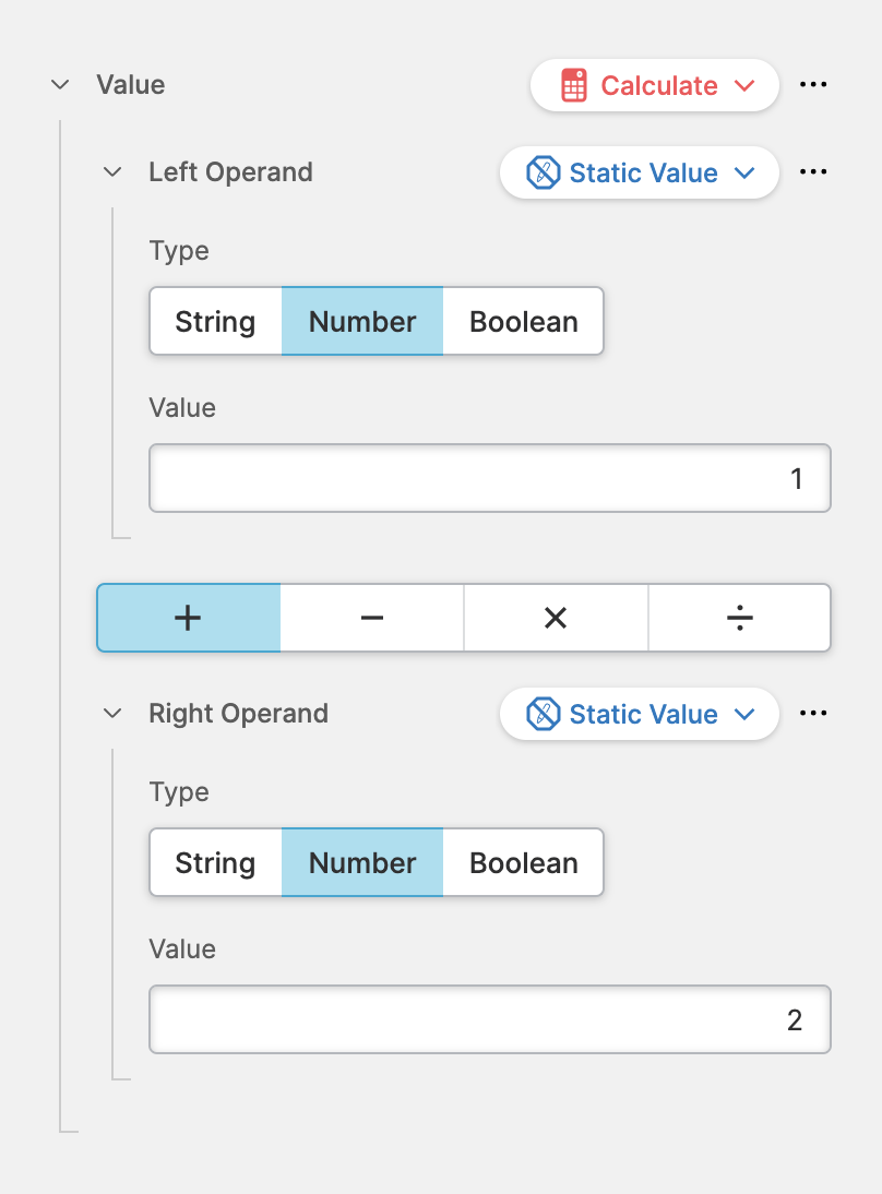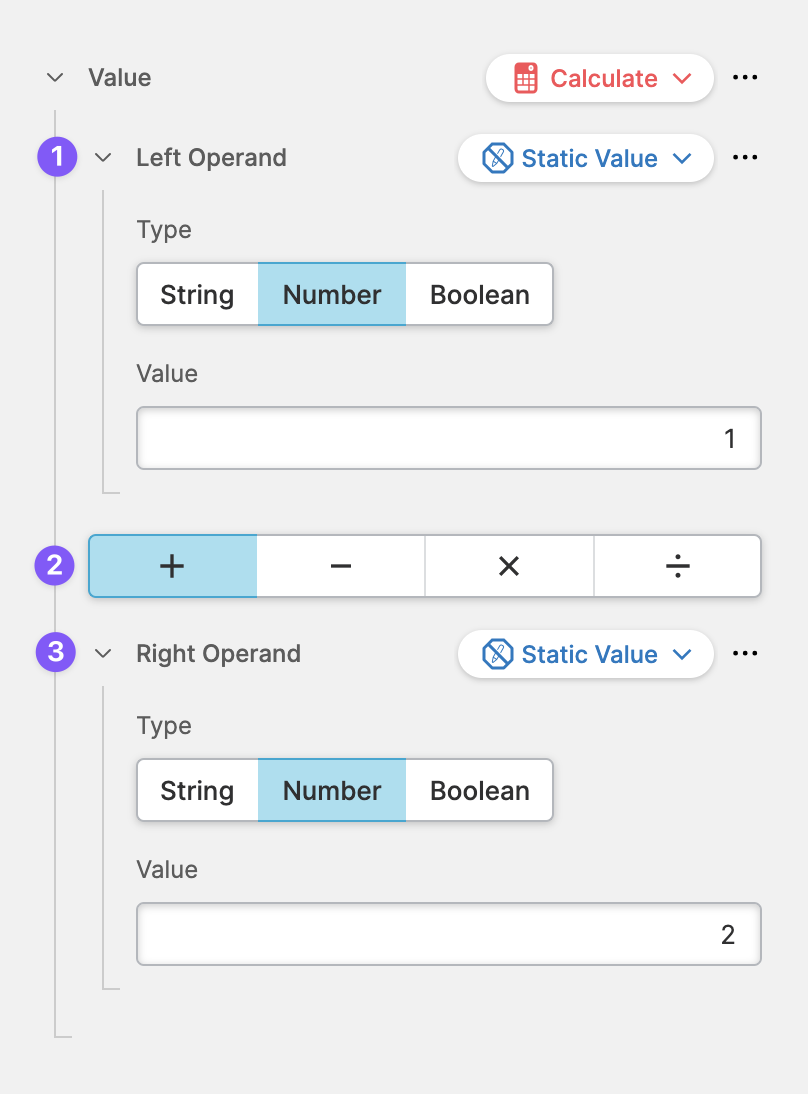 Use a Calculation to solve simpler or more complex mathematical equations between two values (the Left Operand and the Right Operand).