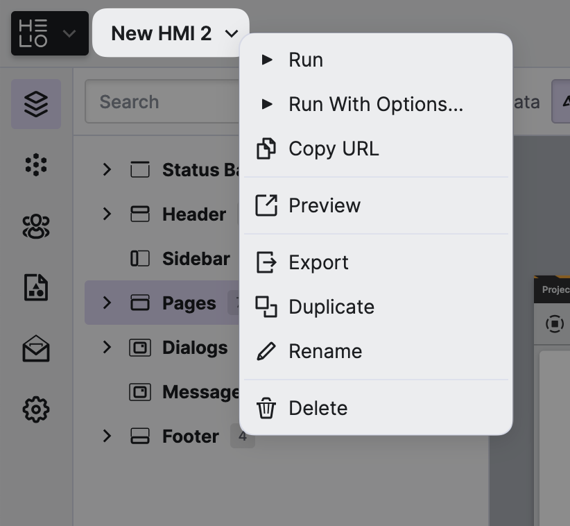 The Project Menu is located in the top bar of the Project Editor. It allows you to execute key actions on the currently open project, such as duplication and renaming.